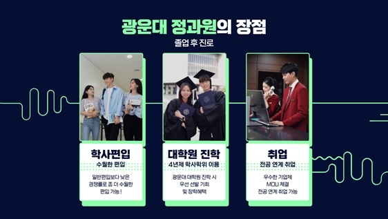 광운대학교 정보과학교육원 관계자는 “수시, 정시 외 전형으로 지원이 가능해 이중등록에 대한 부담없이 추가적으로 지원해볼 수 있으며 인기 전공들이 많이 개설되어 있어 자신이 원하는 전공을 선택해 지원해볼 수 있다는 점이 장점이다”며 “평균 2년~2년 반의 학업 기간으로 광운대 총장 명의의 4년제 학사학위를 조기 취득할 수 있어 이를 통해 대학원 진학, 학사편입, 학사장교, 취업 등 다양하게 진로를 탐색해볼 수 있다”고 설명했다.