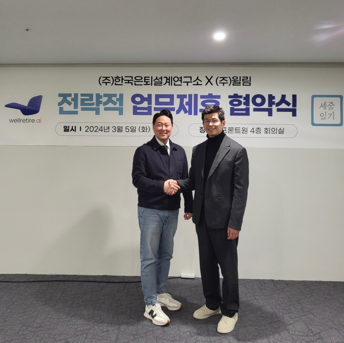 은퇴설계 교육 및 컨설팅 전문기업 ㈜한국은퇴설계연구소(대표 권도형)가 '세줄일기'를 운영하는 ㈜윌림(대표 배준호)와 지난 3월 5일 은퇴설계 솔루션을 위한 상호 협력을 위해 공동협력 업무협약(MOU)을 체결했다고 밝혔다.