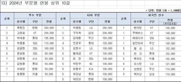 한국 프로야구에서 올해 최고 연봉을 받는 선수는 류현진(한화 이글스)과 박동원(LG 트윈스)으로 나타났다.