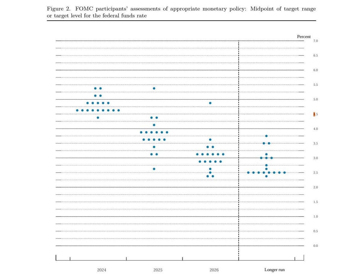미 연준은 이날 성명서를 통해 현행 5.25~5.50%의 기준금리를 동결했다고 밝혔다. 2022년 이후 11차례의 금리 인상 이후 5번째 금리 동결이다. 연준은 성명에서 "인플레이션이 2%를 향해 지속 가능하도록 움직이고 있다는 확신을 얻기 전까지 목표 범위를 축소하는 것은 적절하지 않을 것으로 본다"고 밝혔다.