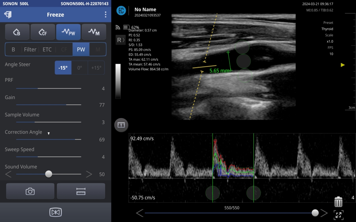 힐세리온의 소논 500L은 VSETM 기술을 통해 기존 모델 대비 3배 이상의 화질을 향상시켰고, 휴대용 초음파에 처음으로 혈류량 측정 기능을 탑재해서 투석 환자의 혈관을 정밀하게 측정이 가능하다.