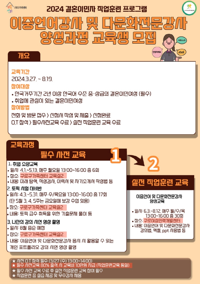 구로여성인력개발센터가 2024 결혼이민자 직업훈련 프로그램의 일환으로 ‘이중언어강사 및 다문화전문 강사 양성과정’의 교육생을 모집한다고 밝혔다.