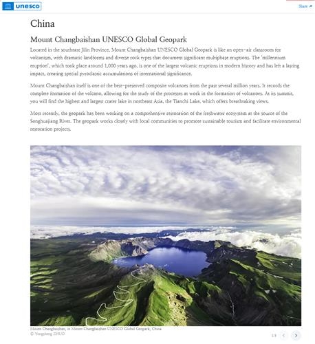28일 유네스코 홈페이지에 따르면 전날 유네스코 집행이사회는 창바이산을 비롯한 18개 후보지를 새 세계지질공원으로 인증했다.