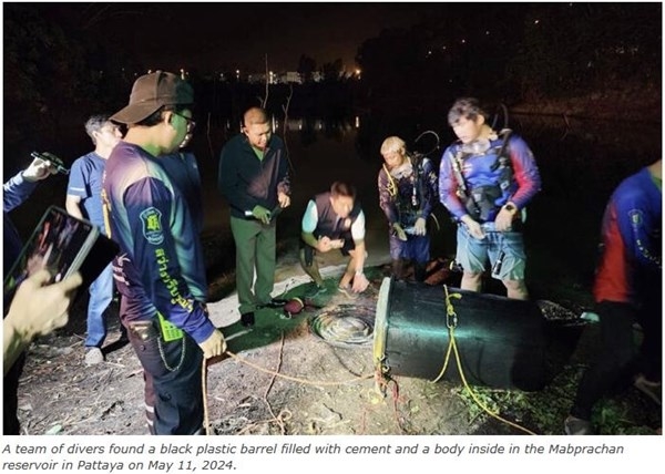 12일(현지시간) 태국 주재 한국대사관과 현지 매체 까오솟 등에 따르면, 태국 경찰은 전날 밤 파타야의 한 저수지에서 시멘트로 메워진 검은색 대형 플라스틱 통 안에 한국인 남성 관광객 A(34)씨의 시신이 담긴 것을 발견했다.