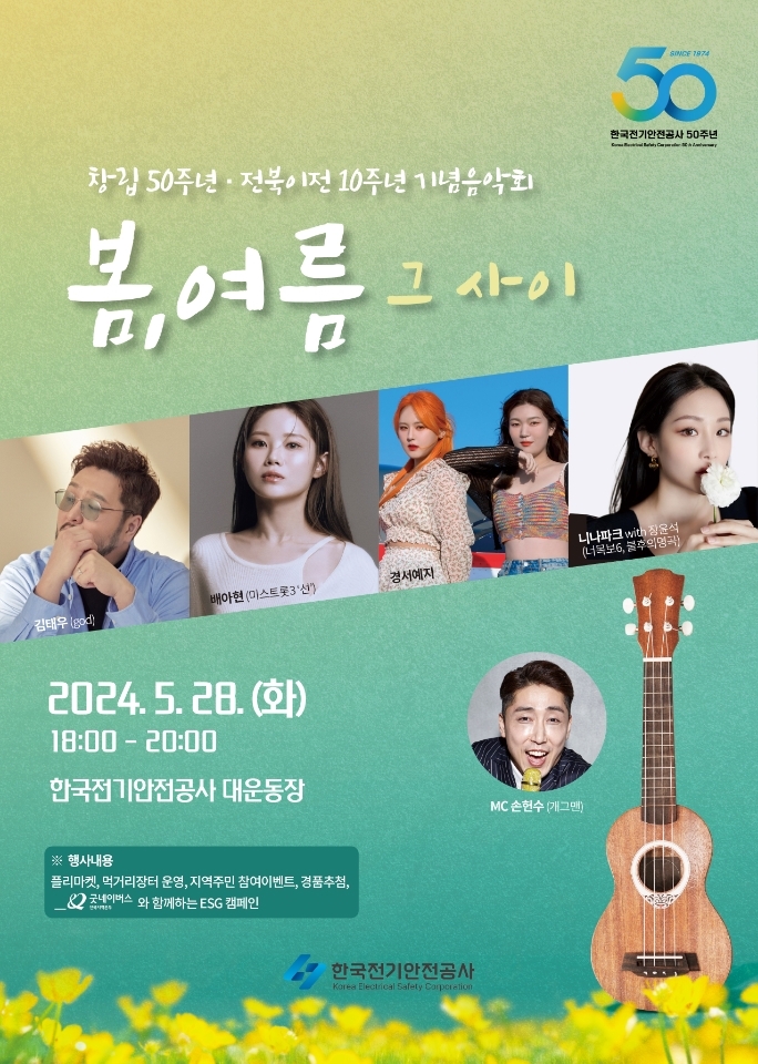 한국전기안전공사(사장 박지현)가 오는 28일(화) 오후 6시, 전북혁신도시에 있는 본사 운동장에서 지역주민과 함께하는 음악회를 연다고 밝혔다.