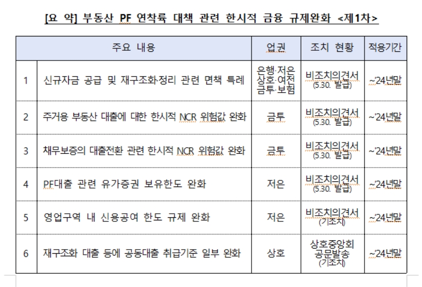 이 밖에 영업구역내 신용공여 한도 규제와 공동대출 취급기준도 완화해 금융사들이 재구조화와 신규 사업자금 공급을 원활하게 추진할 수 있도록 했다.
