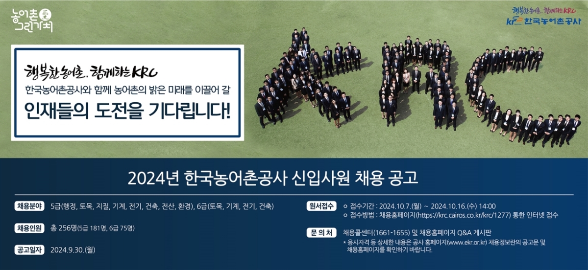 한국농어촌공사가 올해 신입사원 256명을 공개 채용한다고 2일 밝혔다.