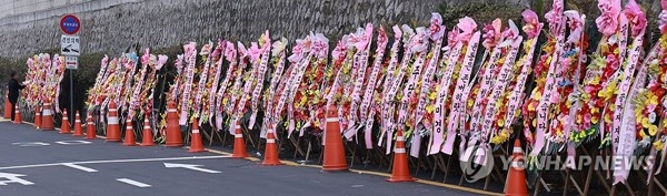 윤석열 대통령을 응원하는 문구를 담아 서울 용산구 대통령실 인근에 세워진 화환들에 불이 나는 일이 발생했다.