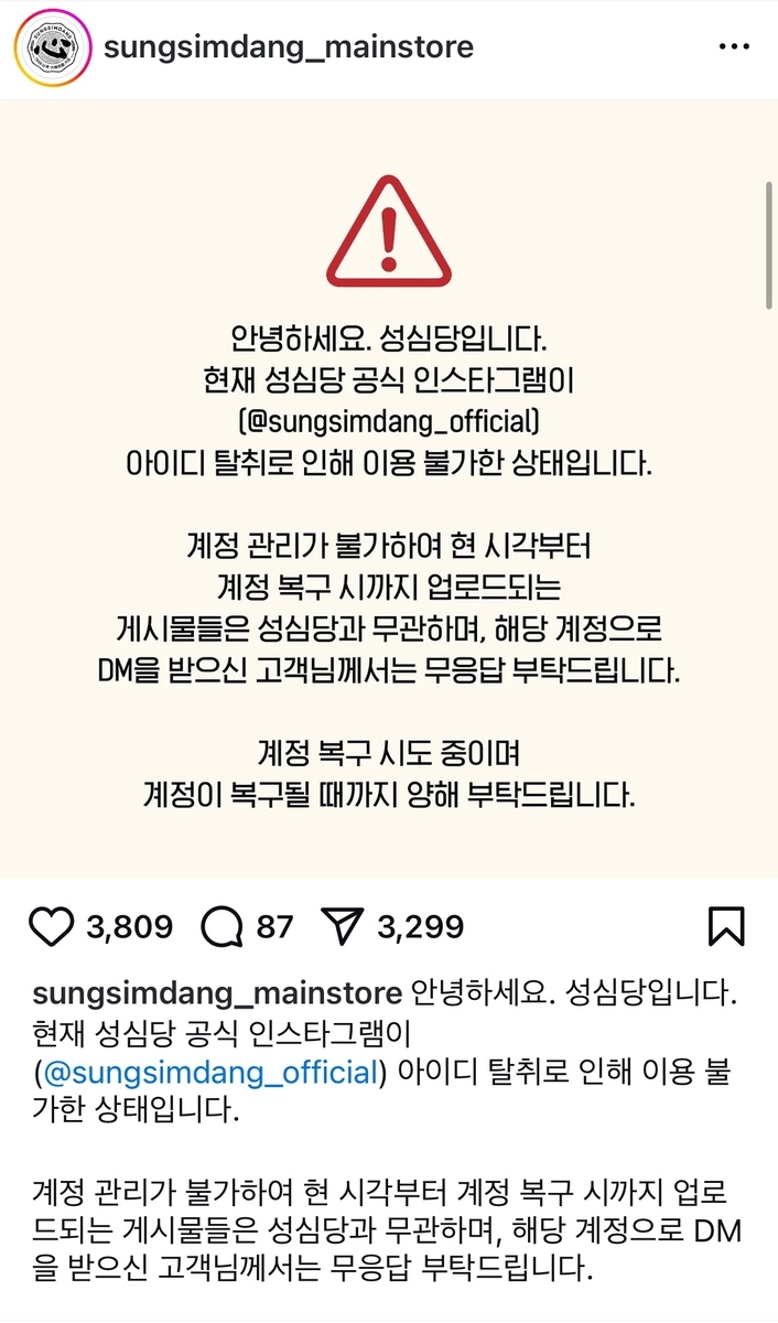 이어 "계정 관리가 불가해 현 시각부터 계정 복구 시까지 업로드되는 게시물들은 성심당과 무관하며, 해당 계정으로 메시지를 받은 고객은 무응답을 부탁드린다"고 당부했다.