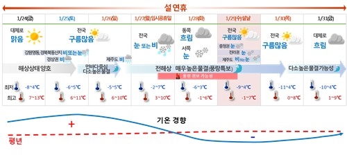 설 전날인 28일과 설날인 29일에는 저기압이 우리나라 북동쪽으로 빠져나간 가운데 우리나라 남동쪽에서 대륙고기압이 세력을 넓히면서 북서풍이 강하게 불어 들어 강수가 이어지겠다.