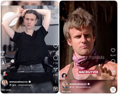 이는 네티즌들이 AI로 만든 가짜 동영상을 편집한 것으로, 마크롱 대통령이 프랑스 코미디 영화의 주인공이나 맥가이버, 디제이, 가수, 헤어 인플루언서 등으로 변신한 모습들이 담겼다.