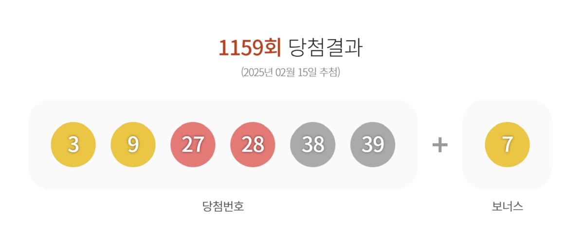 로또복권 운영사 동행복권은 제1159회 로또복권 추첨에서 '3, 9, 27, 28, 38, 39'가 1등 당첨번호로 뽑혔다고 15일 밝혔다. 2등 보너스 번호는 '7'이다.