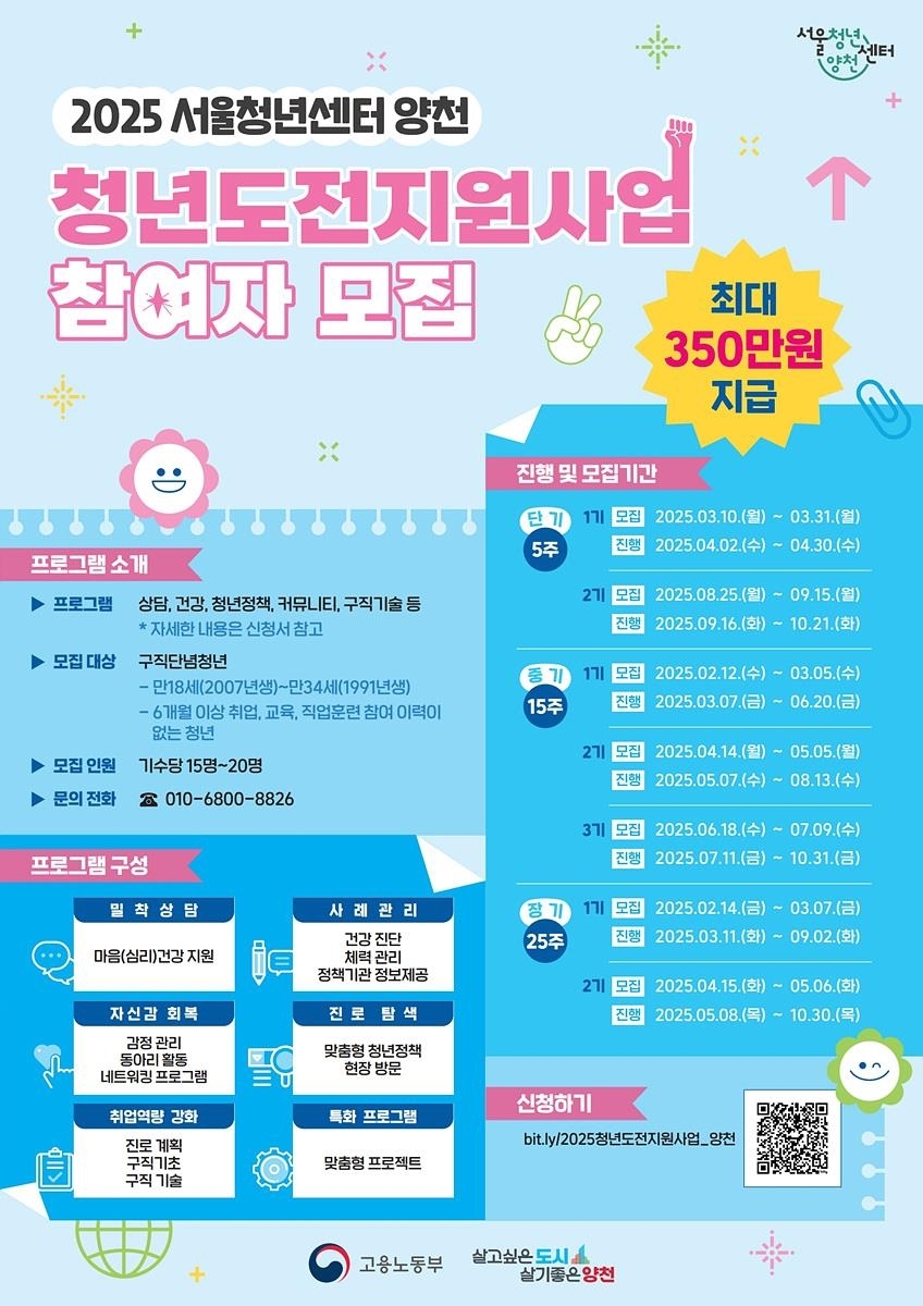 이달부터 모집을 시작해 3월부터 10월까지 기수별로 진행된다. 참여하려면 사업 수행기관인 '서울청년센터 양천' 또는 '고용24' 홈페이지를 통해 신청하면 된다.