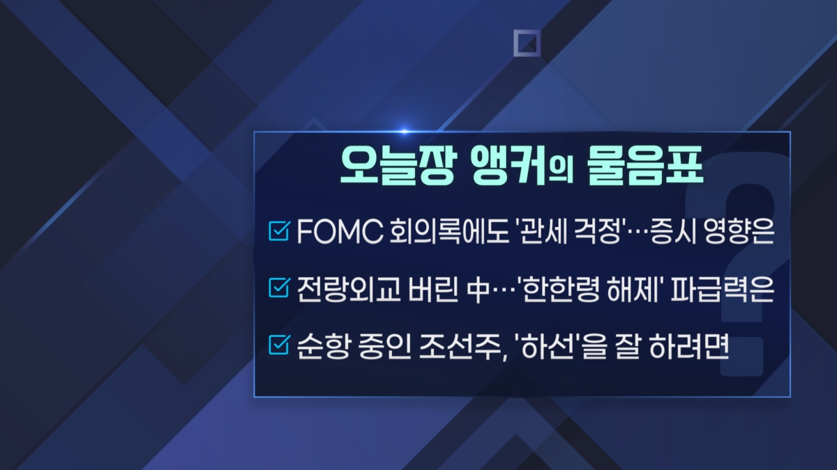FOMC 회의록에도 등장하기 시작한 관세 걱정이 우리 증시에 미칠 영향은 어떤지, 곧 현실화 될 것으로 보이는 중국의 한한령 해제를 앞두고 미리 들여다볼 종목군은 어디인지, 최근 순항주인 조선주, 수익실현을 위한 적절한 시점은 언제일지