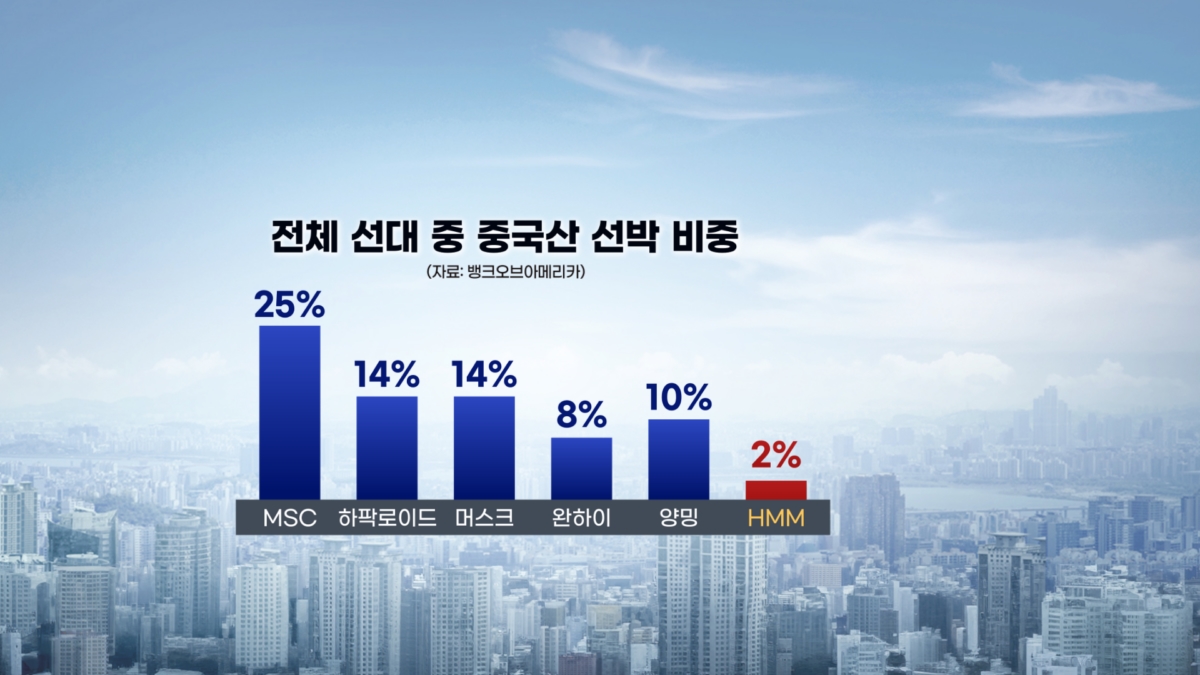 세계 1위 해운사 MSC가 전체 선대에서 중국산 선박 비중이 25%를 차지하는 한편, HMM의 경우 2%로 주요 해운사 가운데 가장 낮아 자금이 몰리고 있고요.