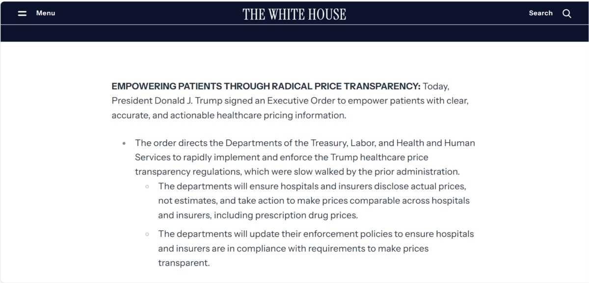 트럼프 대통령은 미국 환자를 최우선으로 하는 의료제도를 보장하기 위해 급진적인 가격 투명성을 오랫동안 촉구해왔다고 밝혔다.