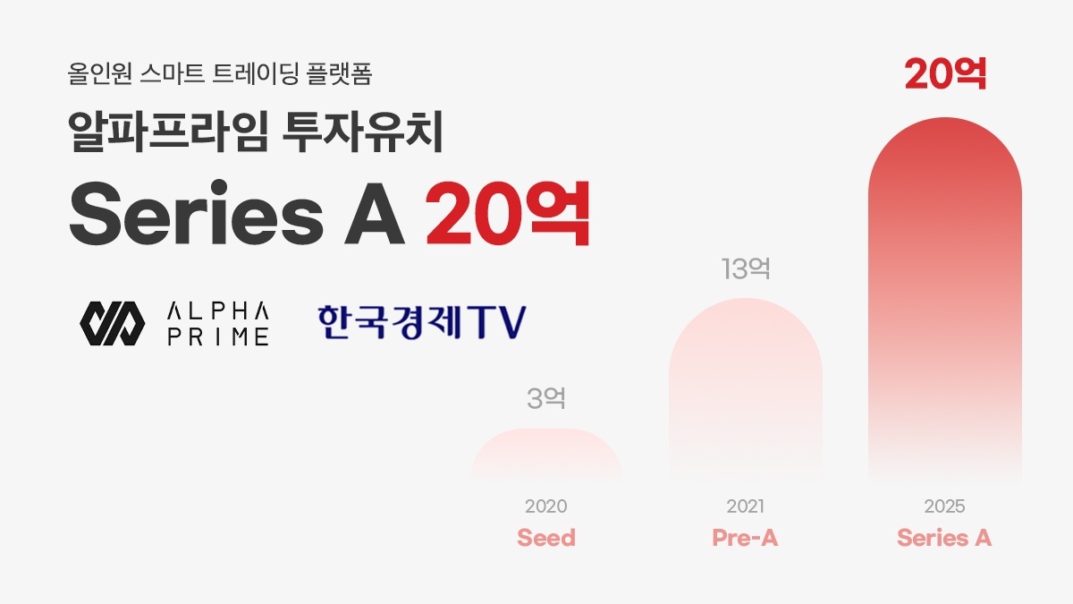 이러한 가치를 인정받은 알파프라임은 이번에 20억 원 규모의 시리즈A 투자 유치를 한국경제TV로부터 성공적으로 마무리하였다. 알파프라임은 과거 슈미트로부터 첫 시드 투자를 유치한 후 슈미트, DSC인베스트먼트, 라이프자산운용으로부터 Pre-A 후속투자를 유치한 이력이 있다.