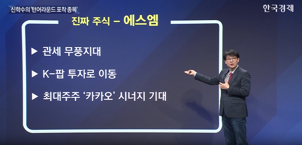 신학수 전문가는 먼저 한한령 관련 대표 종목으로 ▲에스엠(041510)을 언급했다. 그는 “동방신기 재계약 완료, 카카오 최대주주 시너지, K-POP에 대한 글로벌 투자 심리 등을 고려할 때 에스엠은 단순한 테마 종목이 아니라 실적 기반의 확장주”라며 “최근 황금 라인에서의 눌림목 이후 장대양봉이 출현하며 추세 전환을 시도 중”이라고 분석했다.