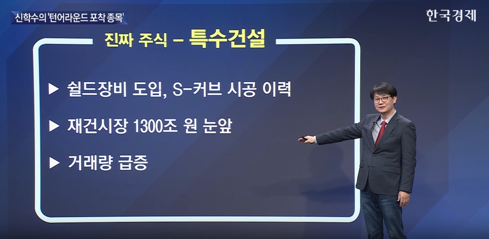세 번째로는 재건 관련 종목인 ▲특수건설(026150)을 제시했다. 신학수 전문가는 “1,300조 규모로 평가되는 국내 재건시장 진입이 임박한 가운데, 특수건설은 고난이도 교량·지하 횡단 구조물 시공 등에서 특화된 기술력을 보유한 기업”이라며, “현재 매집 구간으로 보이는 저점대에서 장대양봉 출현 시 본격적 상승 전환이 가능하다”고 강조했다.