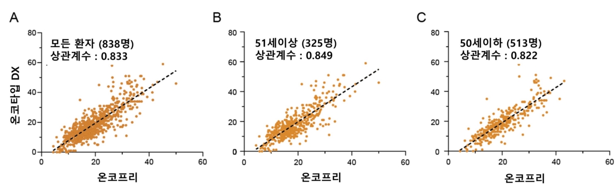 연구팀은 온코타입DX를 받은 환자들의 종양 샘플을 이용해 온코프리 검사를 진행하고, 두 검사법의 예후 예측 점수가 재발 위험과 어떻게 연관되는지 분석했다. 그 결과, 온코프리와 온코타입DX의 예후 예측 점수는 약 83%의 높은 상관관계를 보였다.