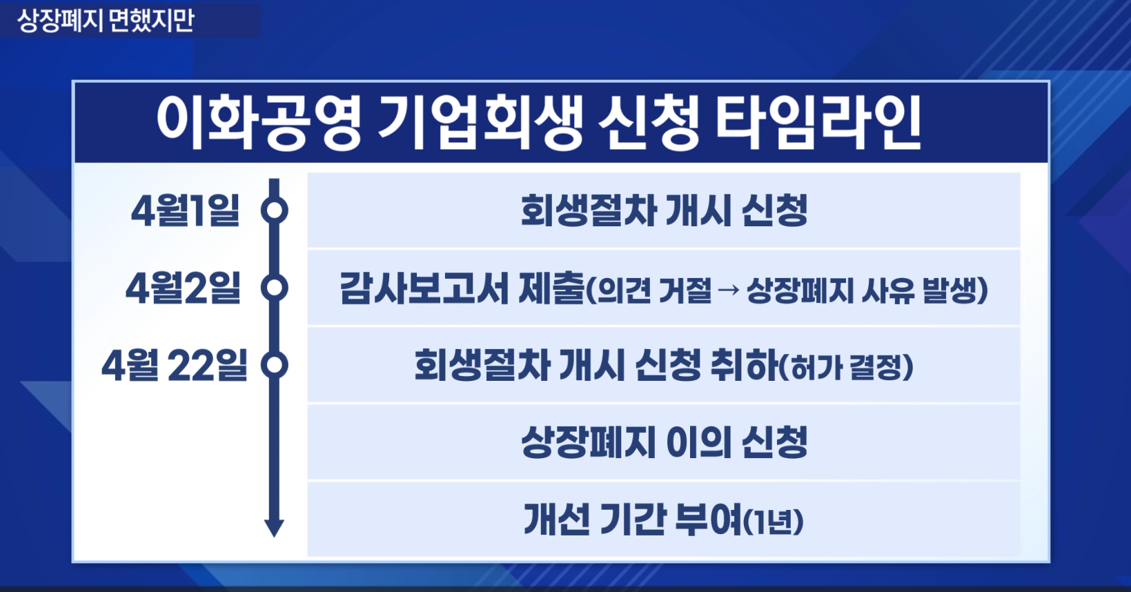 그렇습니다. 사실 타임라인도 묘합니다. 회생 신청 직후 감사 의견 거절 공시가 뜨면서 상장폐지 사유가 발생했고,