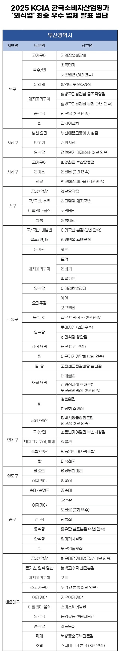 KCA한국소비자평가는 대한소비자협의회가 주최하고 한국소비자평가가 주관하는 <2025 KCIA 한국소비자산업평가 '외식업'> 부산 북구, 사상구, 사하구, 서구, 수영구, 연제구, 영도구, 중구, 해운대구 지역 평가 결과를 발표했다.