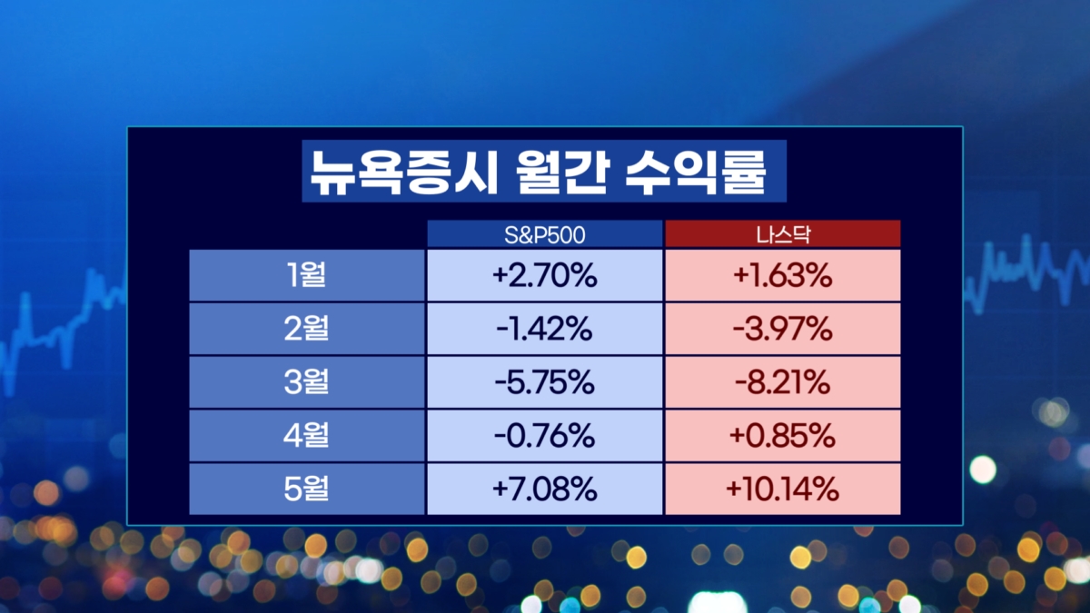 월별로도 보겠습니다. 올해 들어 뉴욕증시 2월과 3월 큰 조정을 겪다가 4월에 반등이 나왔고요, 본격적으로 상승하기 시작한 것은 이달(5월)이었습니다.