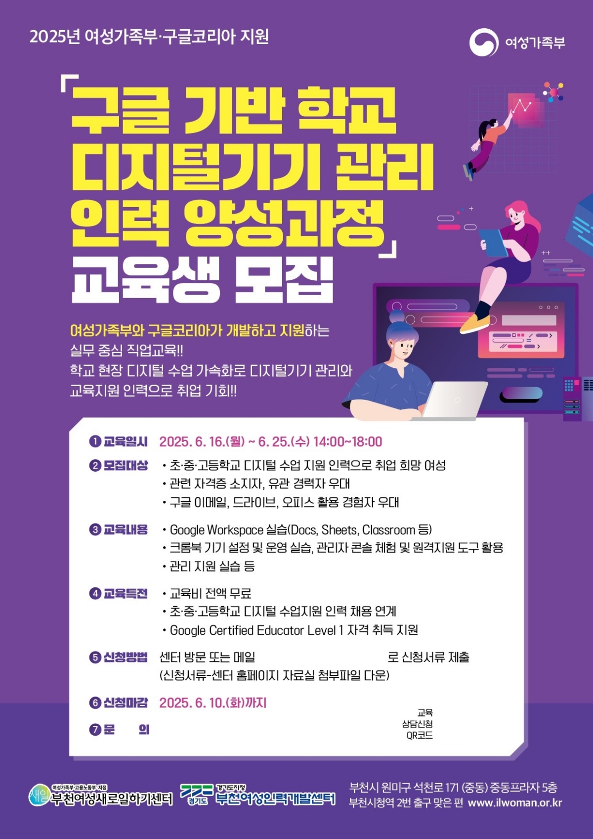 부천여성새로일하기센터는 여성가족부와 구글코리아의 지원을 받아 ‘구글 기반 학교 디지털기기 관리 인력 양성과정’ 교육을 실시하고, 해당 과정에 참여할 교육생을 모집한다고 밝혔다.