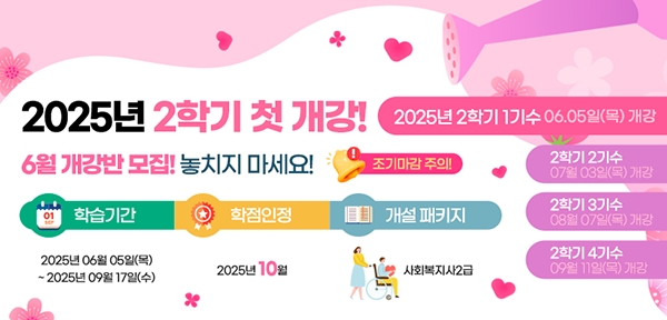 개강일은 6월 5일, 7월 3일, 8월 7일, 9월 11일 등 매월 개강한다. 이번 학기에는 인공지능, 컴퓨터공학, 관광경영학, 경영학 ,체육학, 사회복지사 2급 자격과정 등 총 6개 전공이 운영된다.