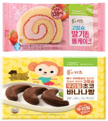 고칼슘 딸기크림 롤케이크 용량은 50g으로 소비기한은 올해 10월 12일이다. 고칼슘 우리밀 초코바나나빵 용량은 22g, 소비기한은 9월 21일이다.
