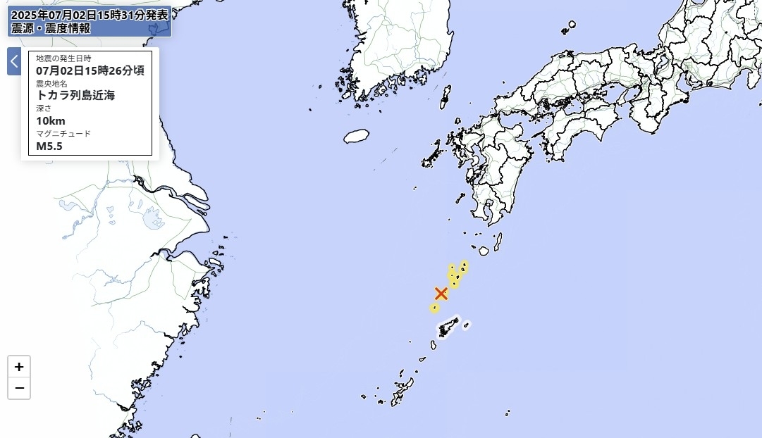 일본 규슈 가고시마현 도카라 열도 해역에서 2일 오후 3시 26분께 규모 5.5의 지진이 발생했다.