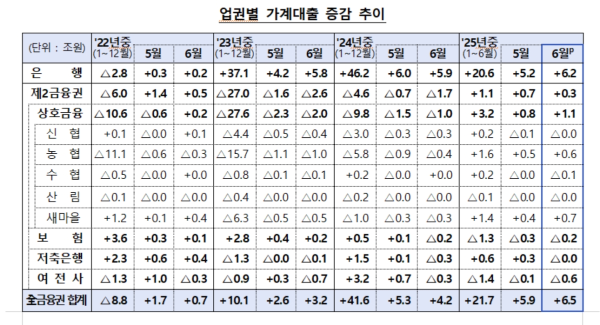 이날 금융위원회·금융감독원이 내놓은 ‘6월 가계대출 동향’ 자료에 따르면, 2금융권까지 포함한 금융권 전체의 가계대출은 6조 5천억원 증가했다. 전월(5조9천억원)보다 증가폭이 더 커졌다. 가계대출은 올해 1월 9000억원 감소했다가 이후 5개월 연속 증가세를 보이고 있다.