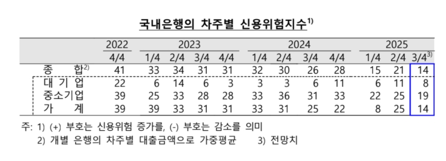 신용위험종합지수는 14로 전분기(21) 대비 7포인트 떨어졌다. 대출주체별로 살펴보면 대기업(8), 중소기업(19), 가계(14) 모두 전분기보다 각각 3포인트, 6포인트, 11포인트 떨어졌다.
