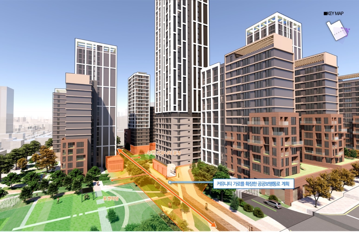 대상지 서측 저층주거지~동측 도림초등학교를 잇는 단지 내 공공보행통로를 배치해 기존 보행이 단절되지 않으면서 안전하고 편리한 통학로를 확보하기로 했다. 또 대상지 서측 가마산로61길은 보도와 차도를 분리하고, 동측 가마산로65길은 보도 추가 확보 등 안전한 보행공간 확보를 최우선한 기획을 마련했다.