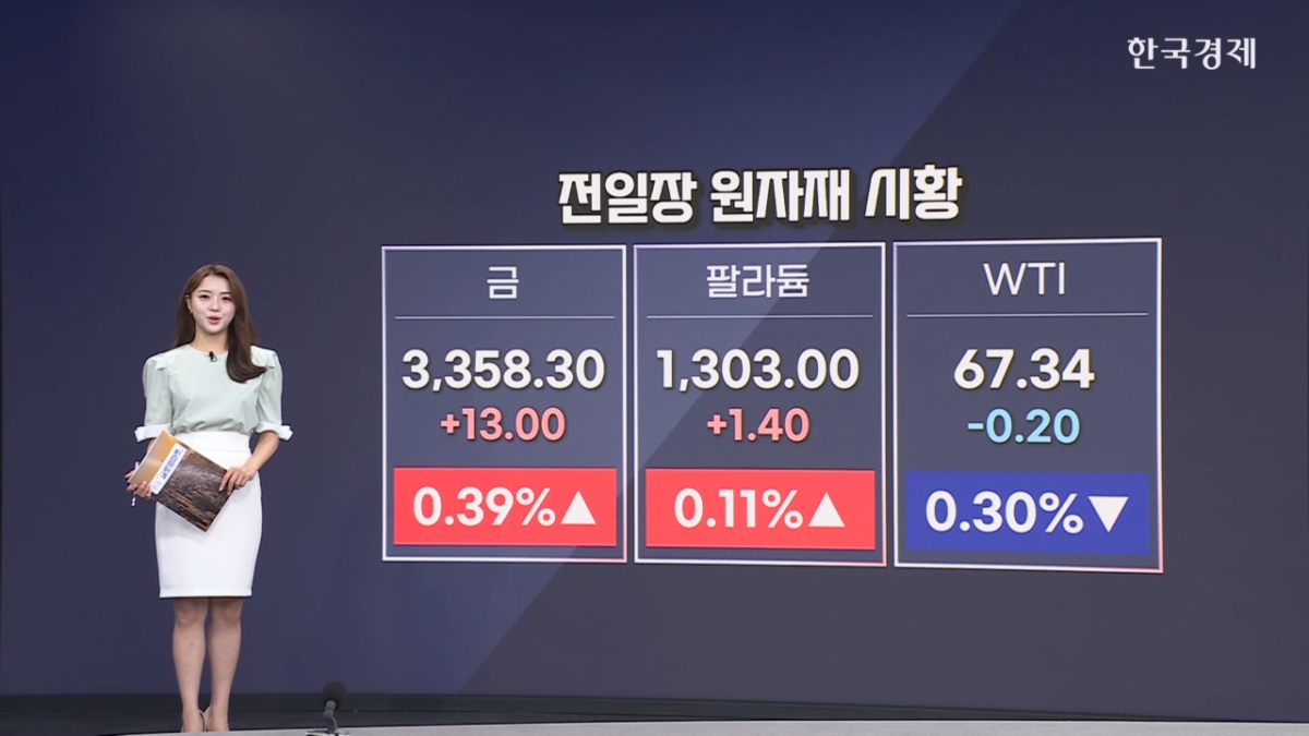 네, 원자재 시황도 살펴보겠습니다. 전일장 눈에 띄었던 원자재 이슈부터 짚어보면, 금은 달러 약세와 경제적 불확실성 영향으로 0.3% 상승했고요. 팔라듐은 소폭 올랐는데, 장기적으로 내연기관차 비중이 줄어들거란 우려에도 불구하고 중국의 새로운 배출가스 규제 도입으로 단기적인 수요 강세가 나타날 수 있단 분석이 나왔습니다. 조금 있다가 자세히 다뤄보도록 하고요. 마지막으로 국제유가는 EU의 새로운 러시아 제재 발표에도 불구하고 시장은 미미한 반응을 보이며 0.3% 하락했습니다.