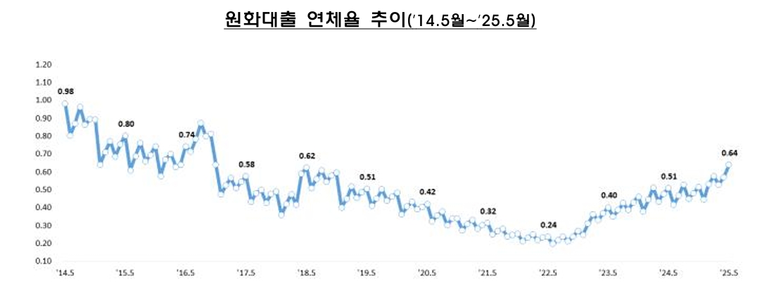25일 금융감독원에 따르면 5월 기준 국내은행 원화대출연체율은 0.64%를 기록해 전달 대비 0.07%p, 전년 동기대비 0.13%p 상승했다.