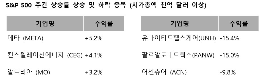 유나이티드헬스케어는 2분기 실적 악화와 더불어 미 법무부 조사를 시인하며 주가가 급락했다. 팔로알토는 250억 달러에 사이버아크 인수를 발표했는데 무리한 인수시도라는 평가가 지배적이다. 어센츄어는 AI 분야 사업 확장에 따른 불확실성, 글로벌 경기 우려에 따른 컨설팅 수요 감소 등 역풍을 맞고 있어 꾸준히 하락세를 보이고 있다.