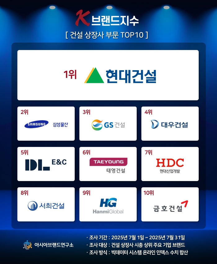 이번 K-브랜드지수 건설 상장사 부문은 건설 상장사 시총 상위 주요 기업 브랜드를 대상으로, 2025년 7월 1일부터 7월 31일까지의 온라인 빅데이터 1013만 8991건을 분석했다.
