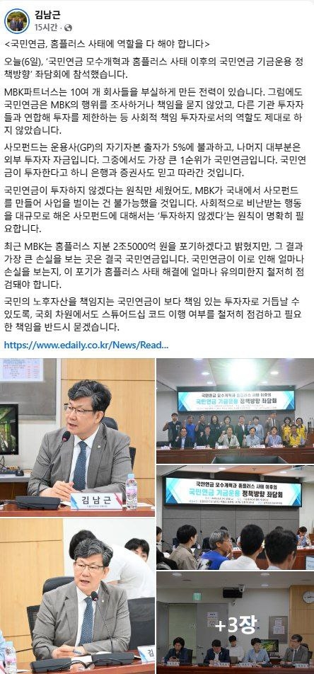 국회 정무위원회 소속 김남근 더불어민주당 의원이 SNS를 통해 홈플러스 사태를 일으킨 MBK파트너스와 MBK파트너스에 투자한 국민연금을 강하게 비판했다.