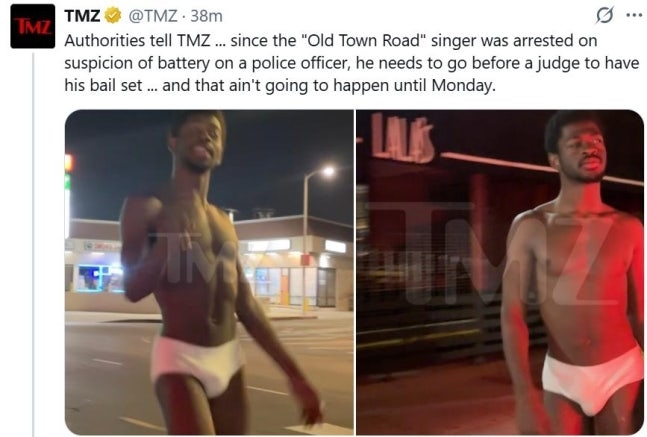 미 연예매체 TMZ가 입수해 공개한 영상에는 릴 나스 엑스가 당일 새벽 4시께 속옷만 입고 흰 부츠를 신은 채 대로 한복판을 걸어 다니며 모델처럼 워킹하는 포즈를 취하고 춤을 추며 노래를 부르는 모습이 담겼다.