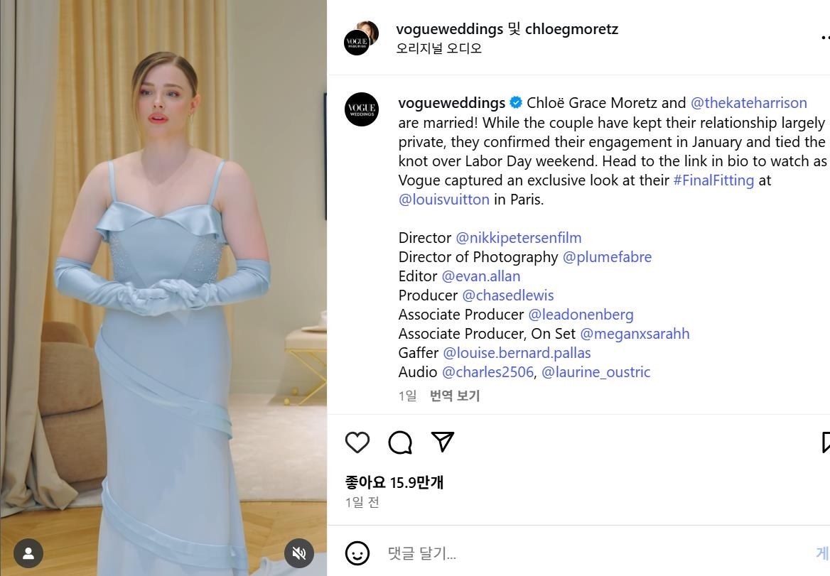 모레츠는 인스타그램에 웨딩드레스를 입은 사진을 올리며 자신의 결혼을 알렸다.