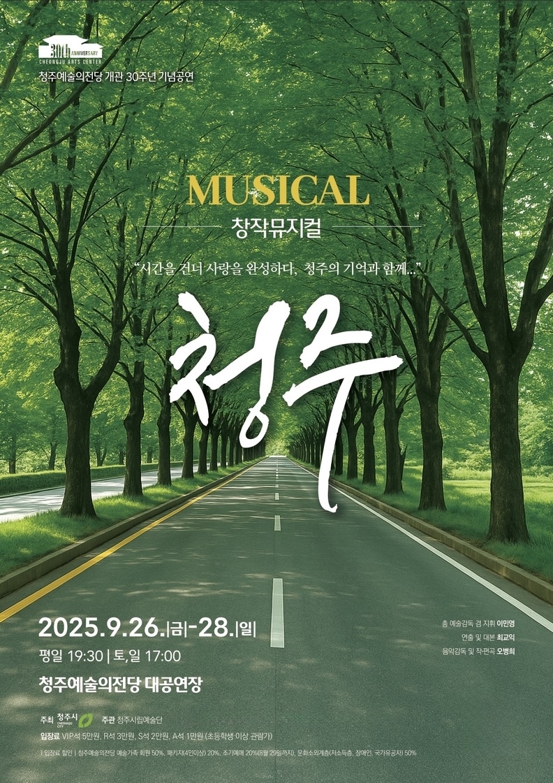 청주예술의전당 개관 30주년을 기념하는 창작뮤지컬 '청주'가 오는 9월 26일부터 28일까지 3일간 청주예술의전당 대공연장에서 막을 올린다.