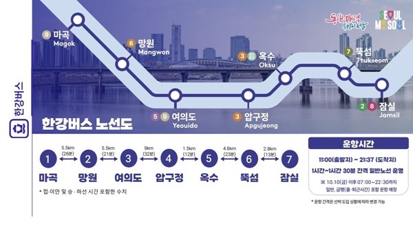 추석 연휴 이후인 10월 10일부터는 평일 오전 7시부터 오후 10시 30분, 주말 오전 9시 30분~오후 10시 30분까지 하루 30회 운항한다. 급행 노선도 추가돼 마곡~잠실 82분이 소요된다.