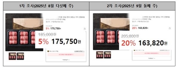 또 할인율은 그대로 두고 정가만 올려 더 비싸게 파는 사례도 있었다. 1차 조사에서는 정가 18만9천원짜리 한우를 10% 할인해 17만100원에 팔더니 2차 조사에서는 정가를 19만5천원으로 올리고 10% 할인해 17만5천500원에 팔았다.