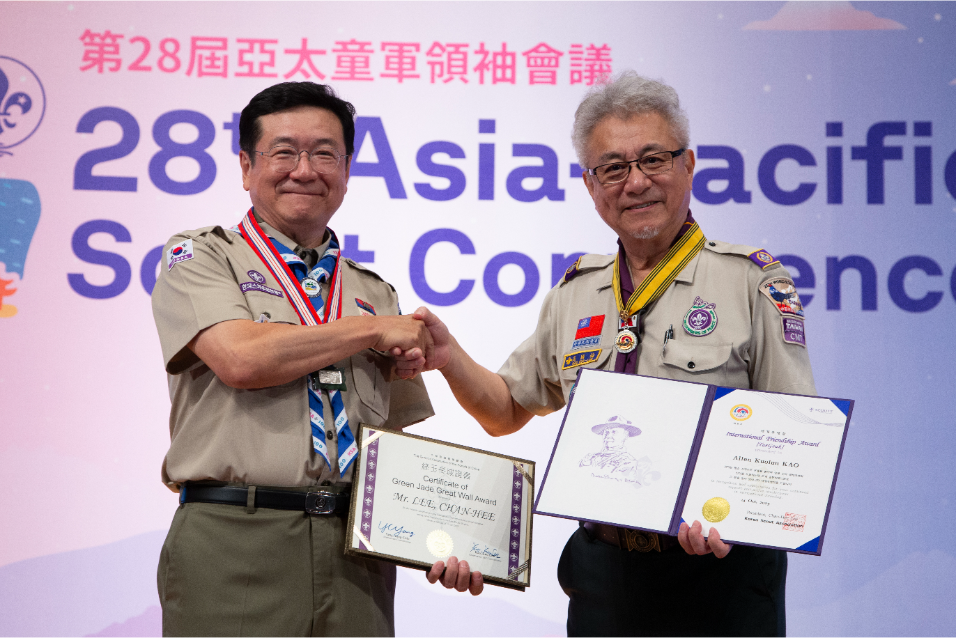 한국스카우트연맹 이찬희 총재가 14일 대만 카오슝에서 열린 제28차 아시아·태평양지역스카우트총회에서 대만스카우트연맹(TGASC)으로부터 외국인에게 수여되는 최고 훈장인 녹옥장성장(China’s International Friendship Award - Green Jade GreatWall Award)을 수상했다.