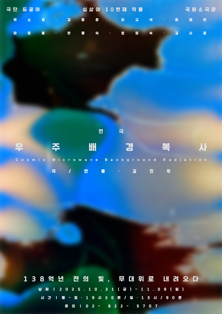 극단 듀공아(대표 김진우)는 오는 10월 31일부터 11월 9일까지 실험연극공간 국화소극장에서 우주배경복사의 발견 이야기를 다룬 연극 ‘우주배경복사’를 공연한다.
