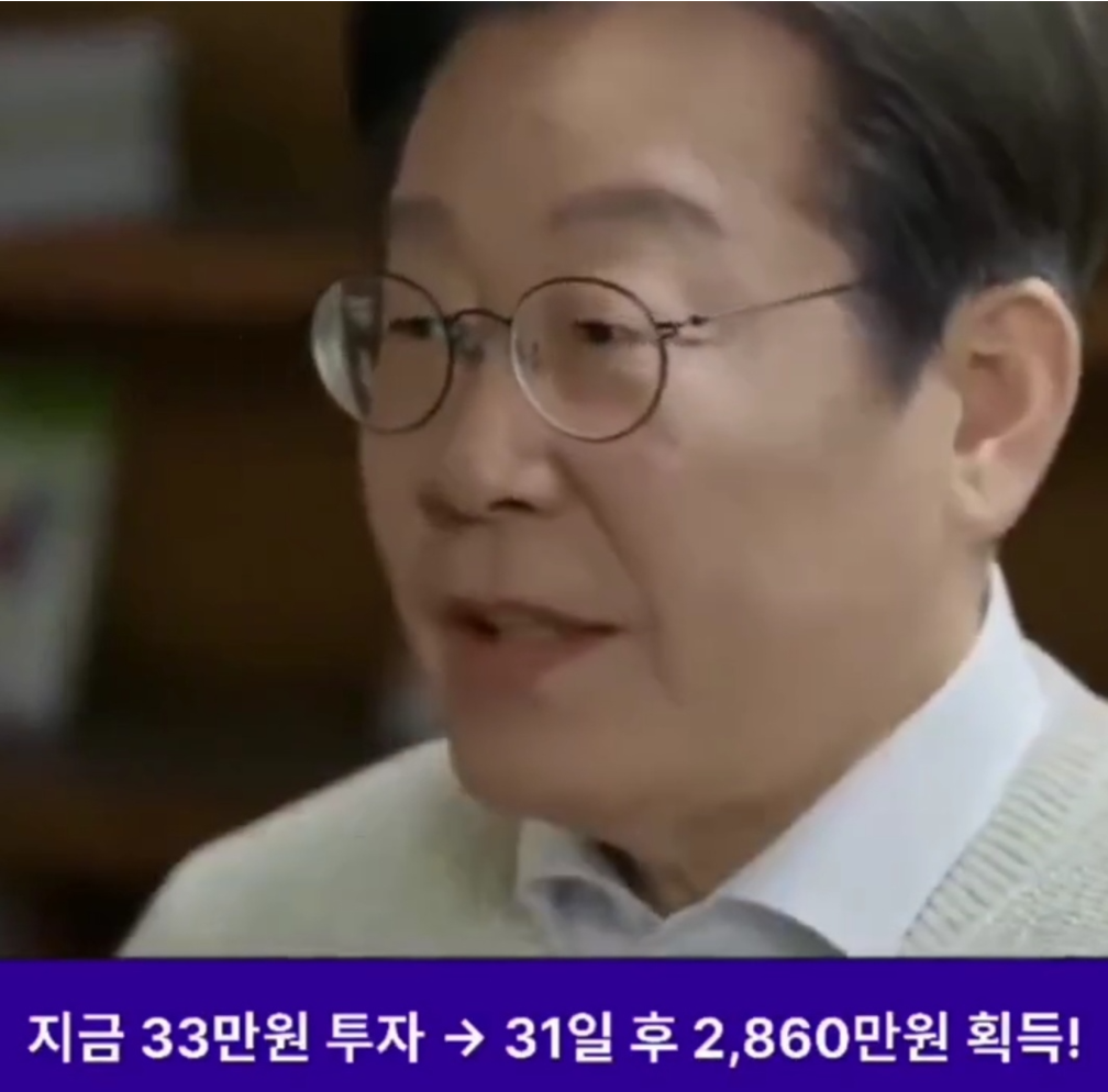 특히 이 대통령이 '삶을 바꿀 기회'라며, "월 30만원을 투자하면 2,400만0,000~3,000만원을 벌 수 있다"고 보장한다. 이는 외국인 제작자가 AI로 합성한 것으로 추정된다.