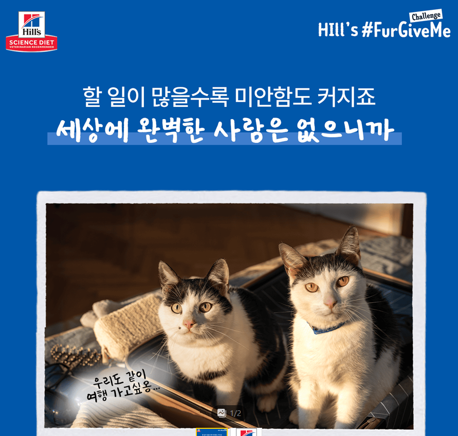 캠페인명 ‘#FurGiveMe’는 반려동물(Fur)과 용서를 구하는 표현(Forgive Me)을 결합한 것으로, 반려인이라면 공감할 수 있는 따뜻한 감성을 반영했다. 힐스는 이번 챌린지를 통해 서로의 이야기를 나누고, ‘미안함’을 넘어 반려동물에게 더 큰 사랑을 실천하는 문화를 확산한다는 계획이다.
