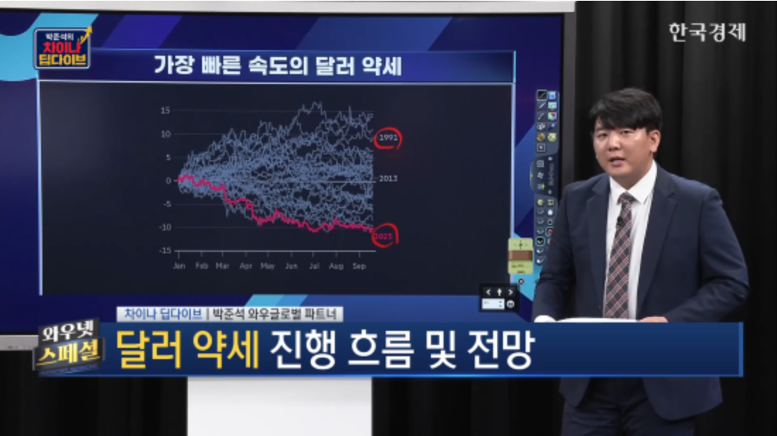 그는 “트럼프의 ‘마가(MAGA)’ 정책 기조가 달러 약세를 유도하고 있다”며 “이로 인해 미국을 제외한 주요국 통화가 강세 흐름을 보이고 있다”고 설명했다. 또한 “MSCI 이머징마켓 인덱스가 약 8% 추가 상승 여력을 지니고 있으며, 특히 중국은 이머징 국가 중 비중이 가장 커 수혜가 예상된다”고 내다봤다. 그는 “골드만삭스 역시 외국인 자금이 테크·AI 중심으로 유입되고 있다고 분석했다”며 “달러 약세 국면에서 중국 시장의 상대적 매력은 한층 부각될 것”이라고 강조했다.