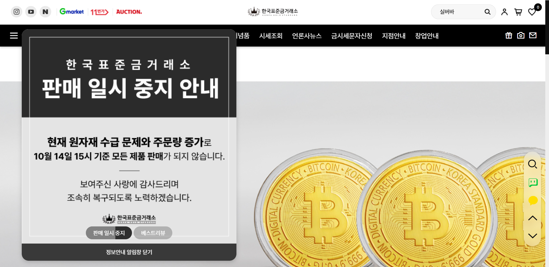 한국표준금거래소가 15일 오후 3시부터 전 제품 판매를 중단했다.